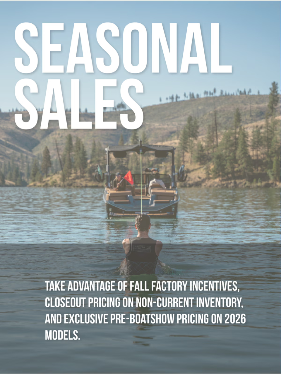 Take advantage of fall factory incentives, closeout pricing on non-current inventory, and exclusive pre-boatshow pricing on 2026 models.